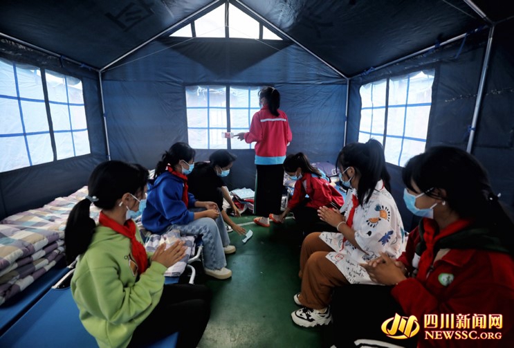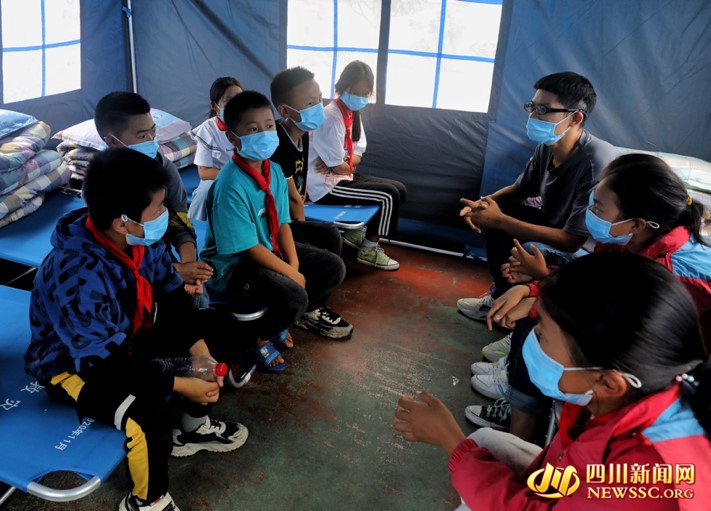老师在帐篷里,对孩子们进行心理疏导