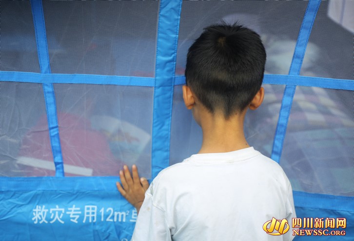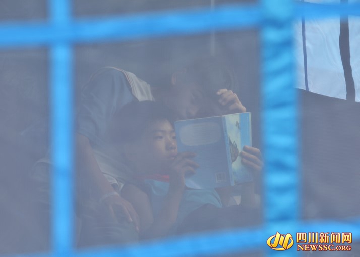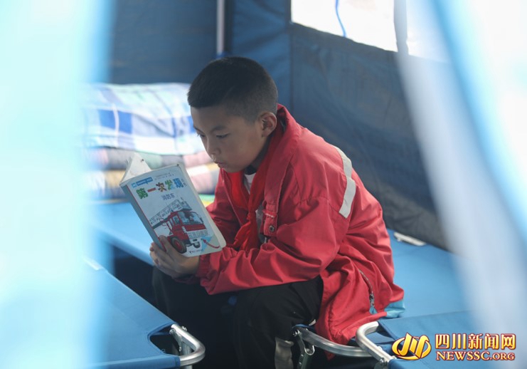 一名男孩在帐篷专心看书。书的封面上“第一次发现消防车”格外醒目,地震发生后,大量消防车赶来救援男孩的家乡