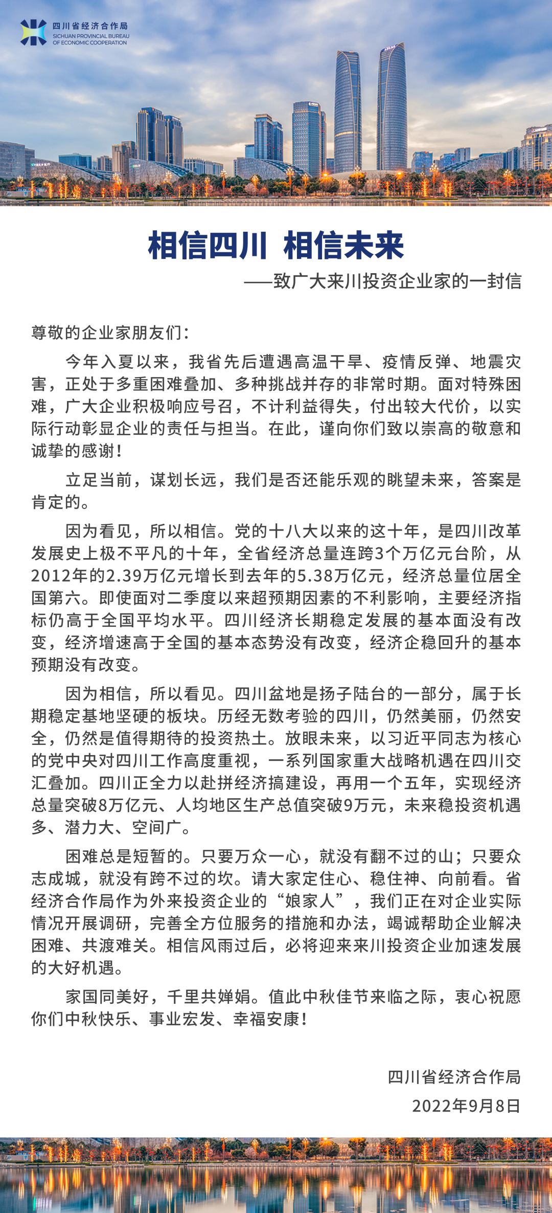 四川新闻网-首屏新闻成都9月8日讯(记者 陈淋)中秋佳节来临之际,9月8日,四川省经济合作局向广大来川投资企业家发出了一封真挚的信《相信四川,相信未来》。