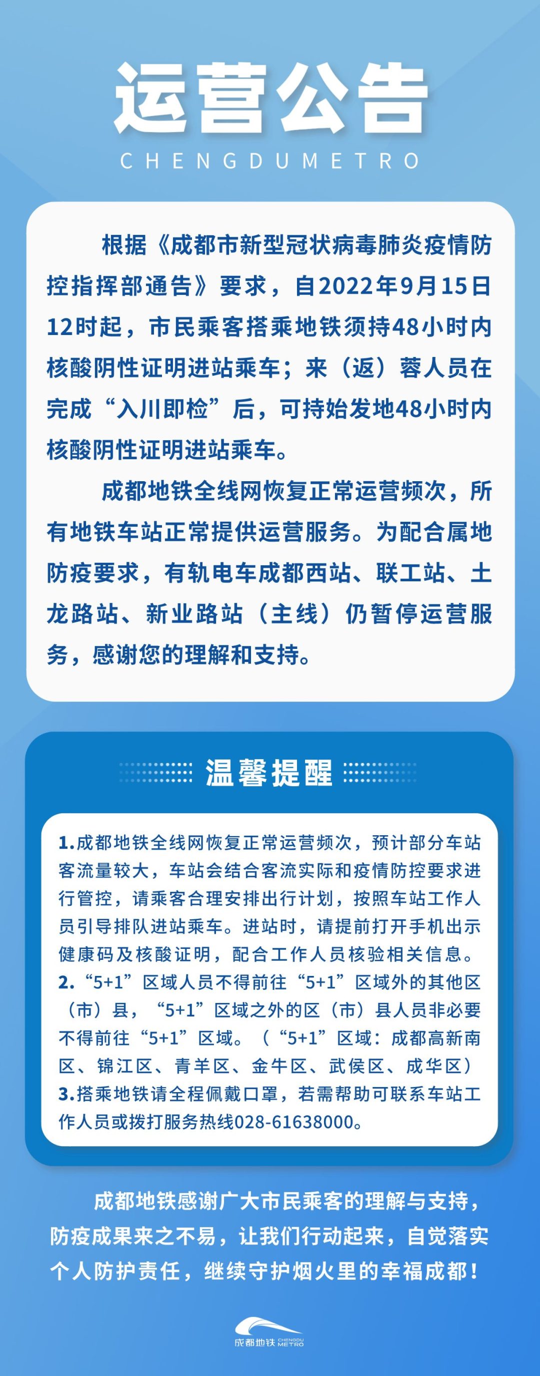 四川新闻网-首屏新闻成都9月15日讯(记者 乔永祯)9月15日,记者从成都地铁获悉,根据《成都市新型冠状病毒肺炎疫情防控指挥部通告》,当前全市疫情防控取得阶段性成效,形势总体可控,平稳向好。除部分区域部分街道外,成都市其他区域自2022年9月15日12时起,逐步有序恢复正常生产生活秩序。