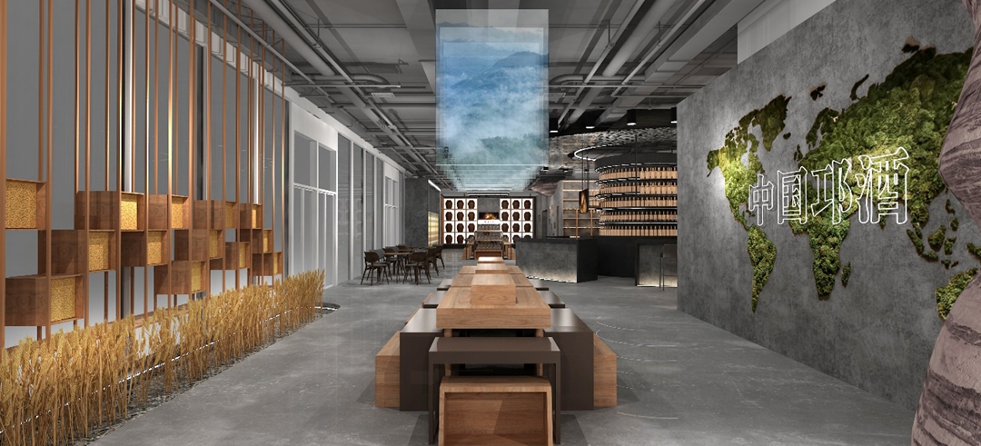 而醉美邛崃·研酒馆以“以邛酒 敬丰收”为主题,按照“从一粒种子到一杯邛酒”的酝酿历程作为装修设计理念,以冰川水、崖谷地等自然元素重现邛崃独特的自然环境,并将邛崃温度、湿度、风速度、日照度、海拔度、土壤成分度、粮食品质度、水质度、酿酒工艺度等“黄金九度”美酒基因具像化,见证优质粮种在邛崃得天独厚的自然环境中,落地、发芽、生长、灌浆、成熟、收获,得以酝酿成一杯美酒的过程。