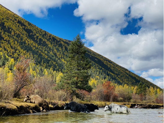 漫步在景区的步游道上,走入层林尽染的原始森林,静默的雪山背景下,高大的杉树依旧苍翠,其他的树叶却或红或黄,如同绮丽的油画在眼前徐徐展开。