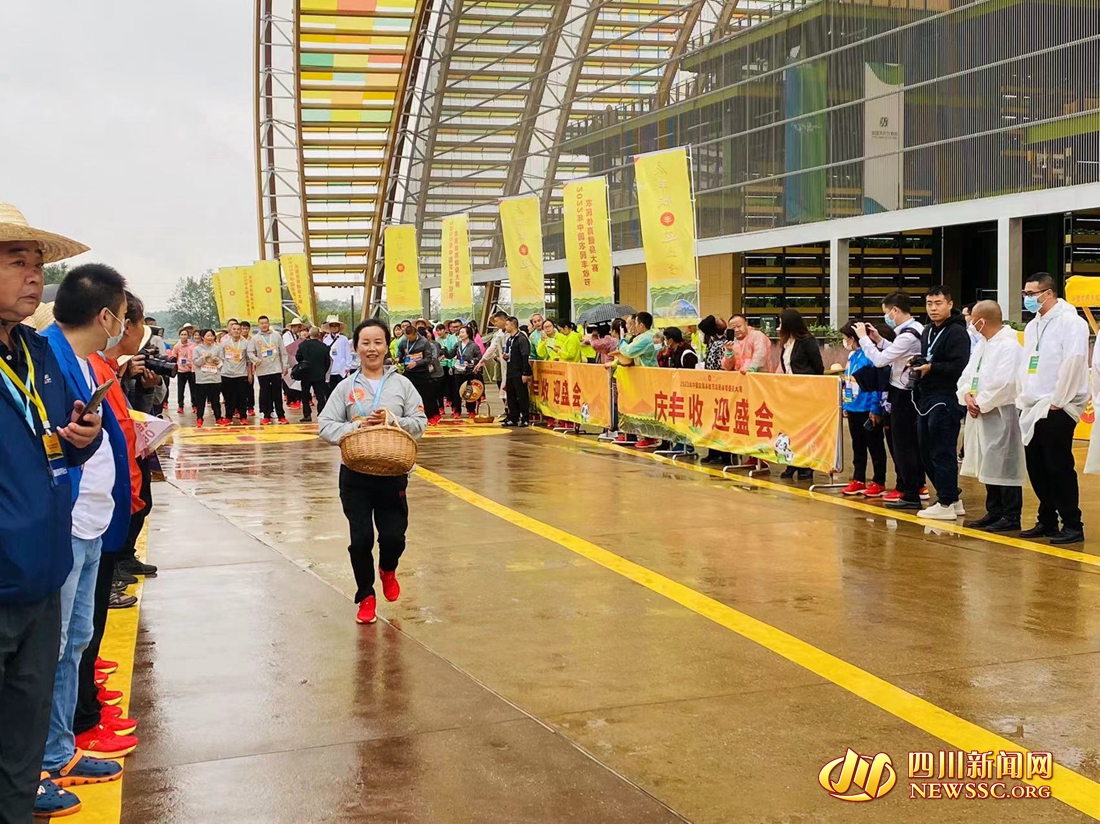 虽然天空细雨蒙蒙,但天府农博主展馆的G1馆及周边区域却热闹非凡,大家挑着箩筐“过桥”,健步如飞。在中国农民丰收节全国农民体育健身大赛现场,晒场收谷庆丰年、车轮滚滚向未来、瓜果连连共富裕、接续奋进促振兴等,农业特色突出、农村广泛普及的健身活动依次进行,洋溢着丰收的喜悦。