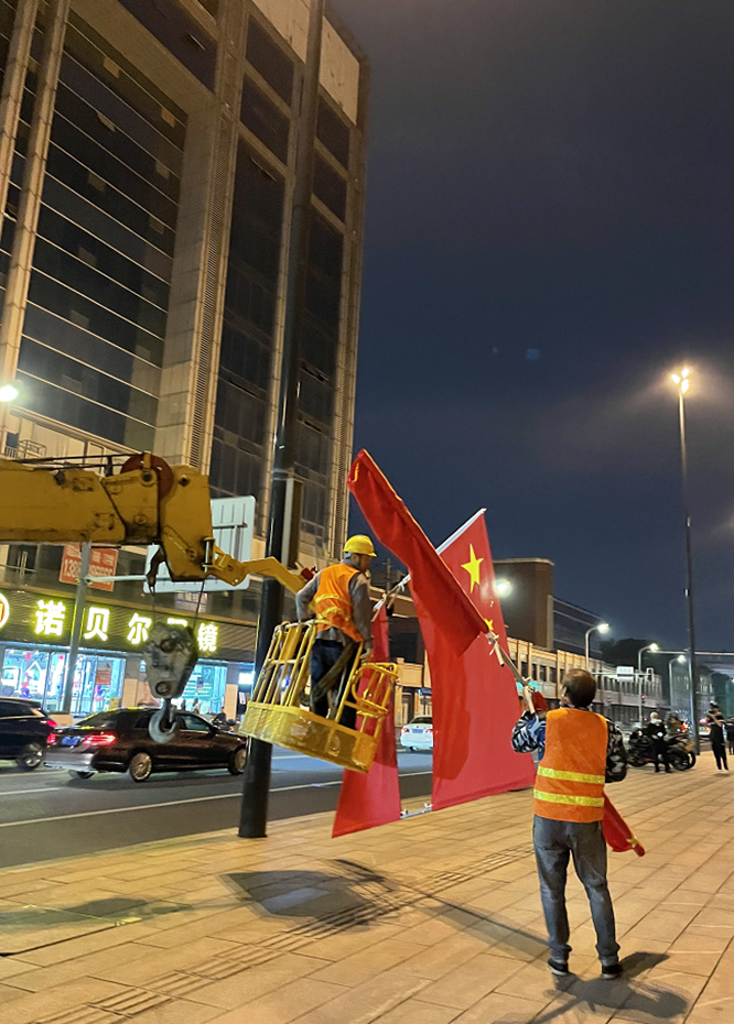 从2022年9月25日开始,成都市城管委组织中心城区陆续在天府广场、人民南路、天府大道、蜀都大道东西段、成华大道、金牛大道、迎宾大道等80余条重要路段、区域以及城市交通要道、交通枢纽、旅游景点周边道路灯杆上悬挂国旗,同时,其他区(市)县根据辖区内实际情况自行安排悬挂路段和规模。预计“5+2”中心城区悬挂国旗2万余面,全市悬挂国旗6万余面。