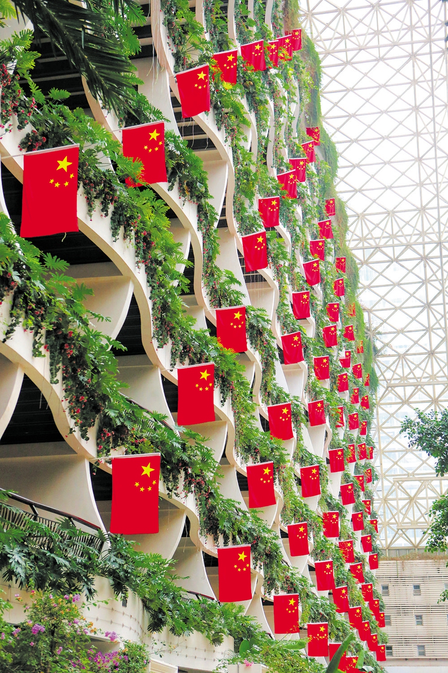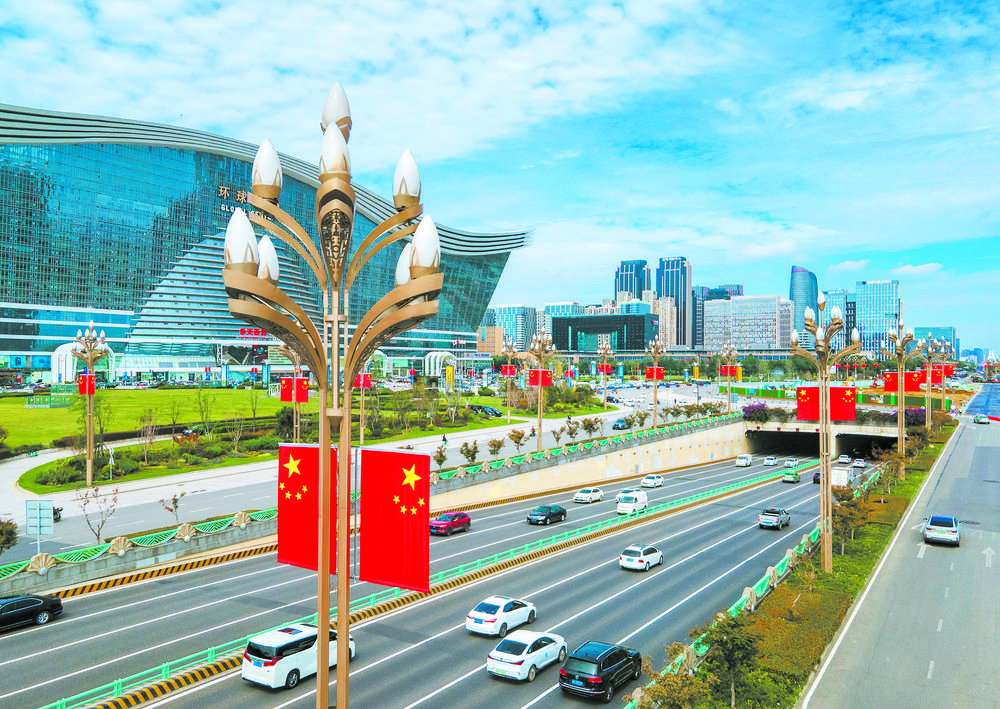 天府大道上,红旗迎风飘扬