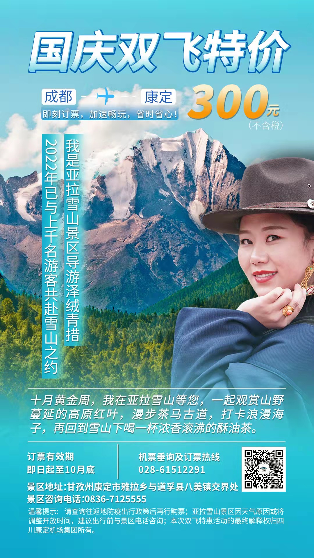 国庆黄金周将至,为抓好甘孜州旅游经济,康定机场集团所辖三个机场已做好迎接旅客准备。康定机场集团与四川航空为旅客提供了劲爆的双飞价格:成都=稻城往返1100元(不含税)、西安=稻城往返800元(不含税)、重庆=稻城往返1400元(不含税)、珠海=稻城往返2060元(不含税)、成都=康定往返300元(不含税)、杭州=康定往返800元(不含税)、重庆=康定往返400元(不含税)、重庆=格萨尔往返1200元(不含税)。