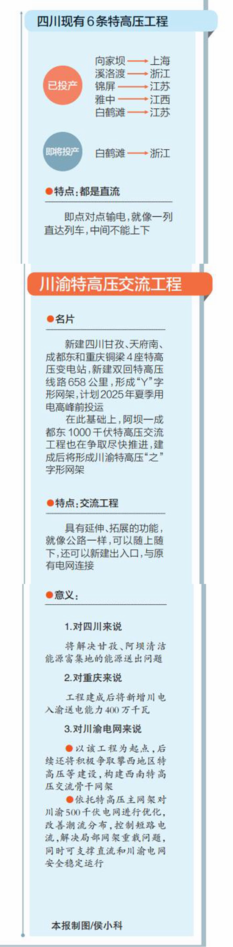 目前,四川已有向家坝—上海、溪洛渡—浙江、锦屏—江苏、雅中—江西、白鹤滩—江苏5条特高压工程投产,白鹤滩—浙江特高压工程也即将投产。但是,这6条特高压工程都是直流,即点对点输电,就像一列直达列车,中间不能上下。川渝特高压工程是特高压交流工程,具有延伸、拓展的功能,就像公路一样,可以随上随下,还可以新建出入口,与原有电网连接。