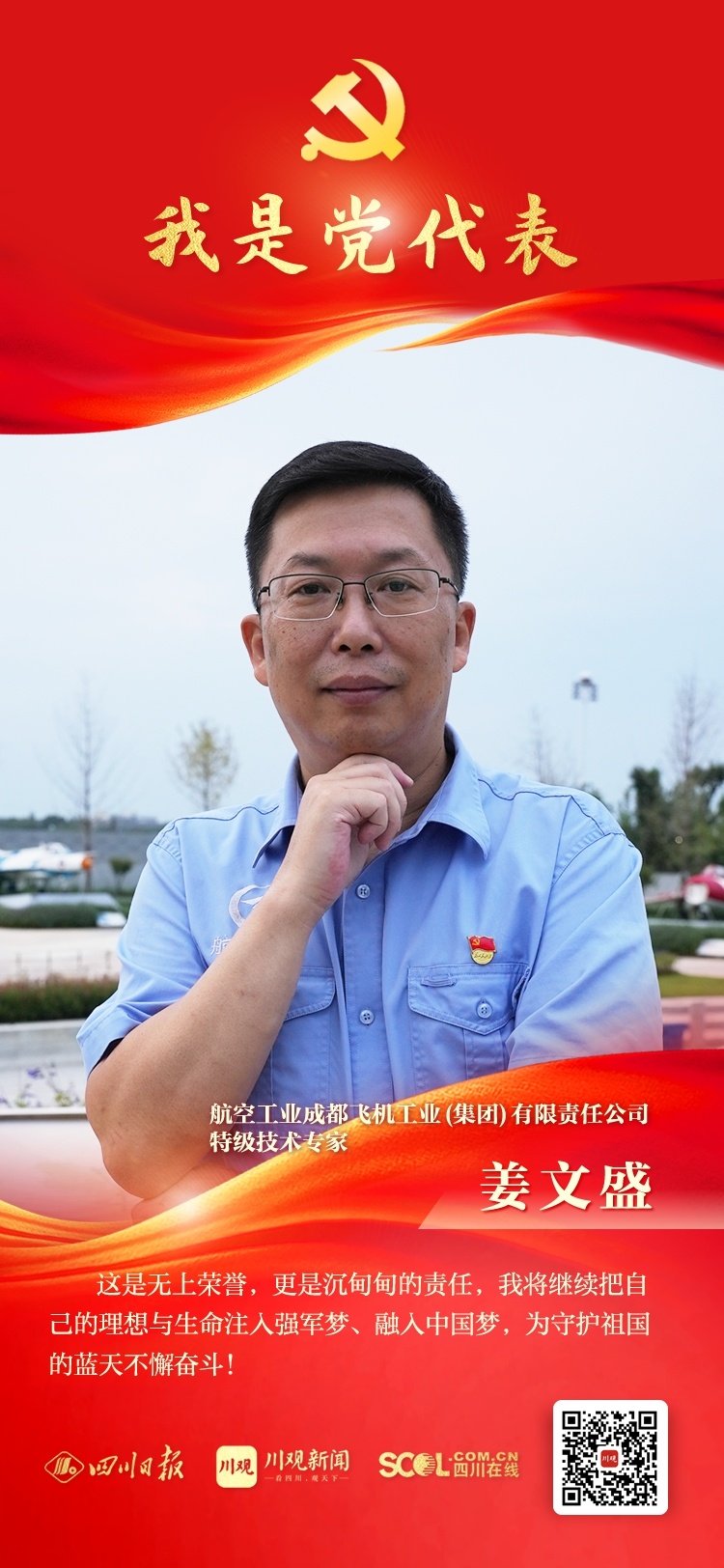 择一业,精一生。在航空工业成都飞机工业(集团)有限责任公司,从一名普通试验员到组长、科长,从总工艺师再到首席工艺师,姜文盛将自己的领域专研到了极致,成为了公司特设专业当之无愧的带头人。1998年12月,姜文盛加入了中国共产党,在党徽照耀下,更是全身心地投入到理想和事业上。