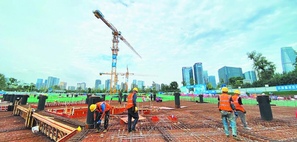 工地上机器轰鸣、吊臂起落、工人正紧张有序地忙于绑扎地下室结构钢筋。“这个工种直接关系到项目的质量与安全,工作虽然辛苦,但还是感觉很值得。”建筑工人吴师傅说道,“这个国庆节就不回家了,等项目年底交付后,春节再回家。”
