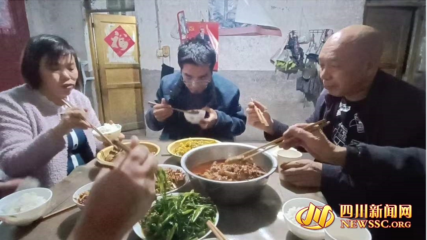 “炖土鸡、家常南瓜……”当天晚上,一家人围坐在一起,吃上了这顿团圆饭。