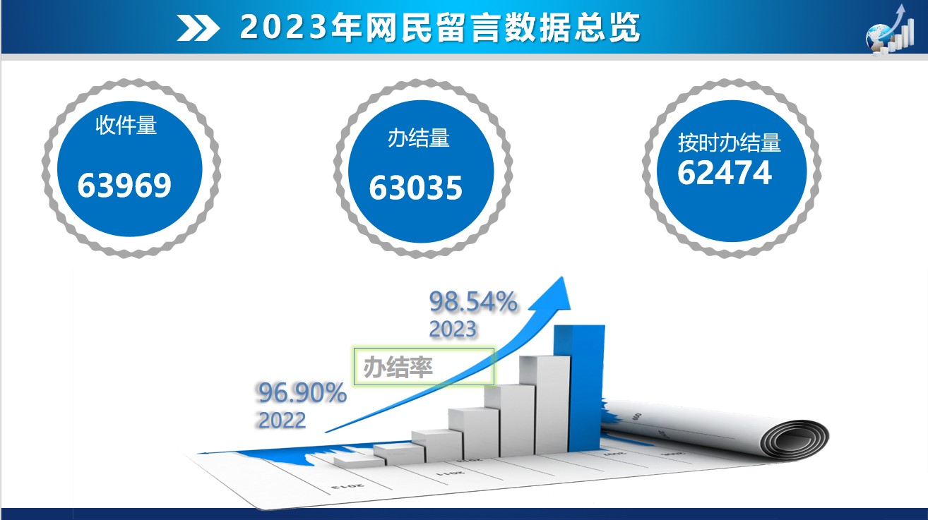 2023年全省各级各部门的网上群众工作进一步提质增效。“群众呼声”共收到留言63969件,其中办结63035件,与2022年同期相比,办结率从96.90%提升至98.54%,96.55%的留言在5—15个工作日内得到及时回应,群众满意率达96.46%。