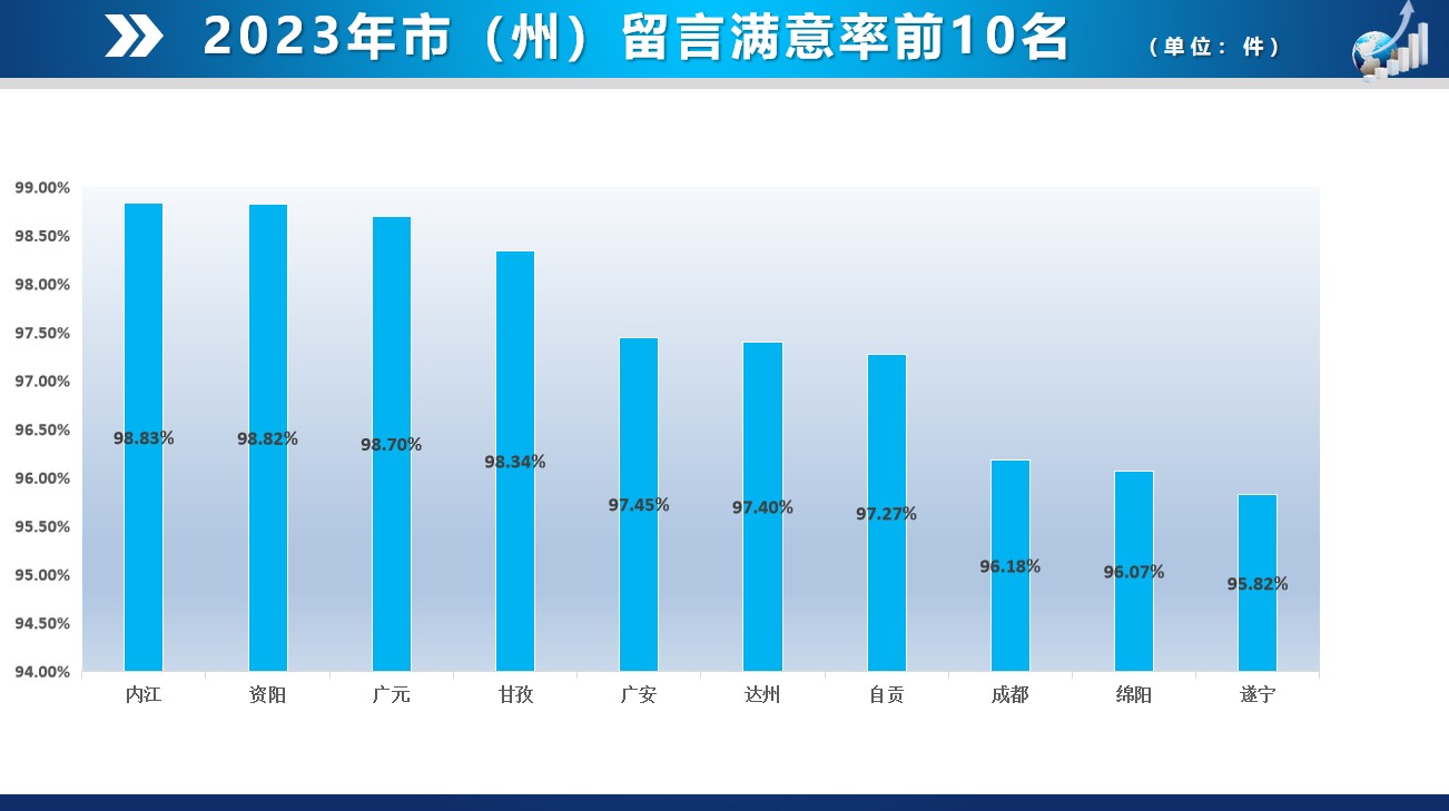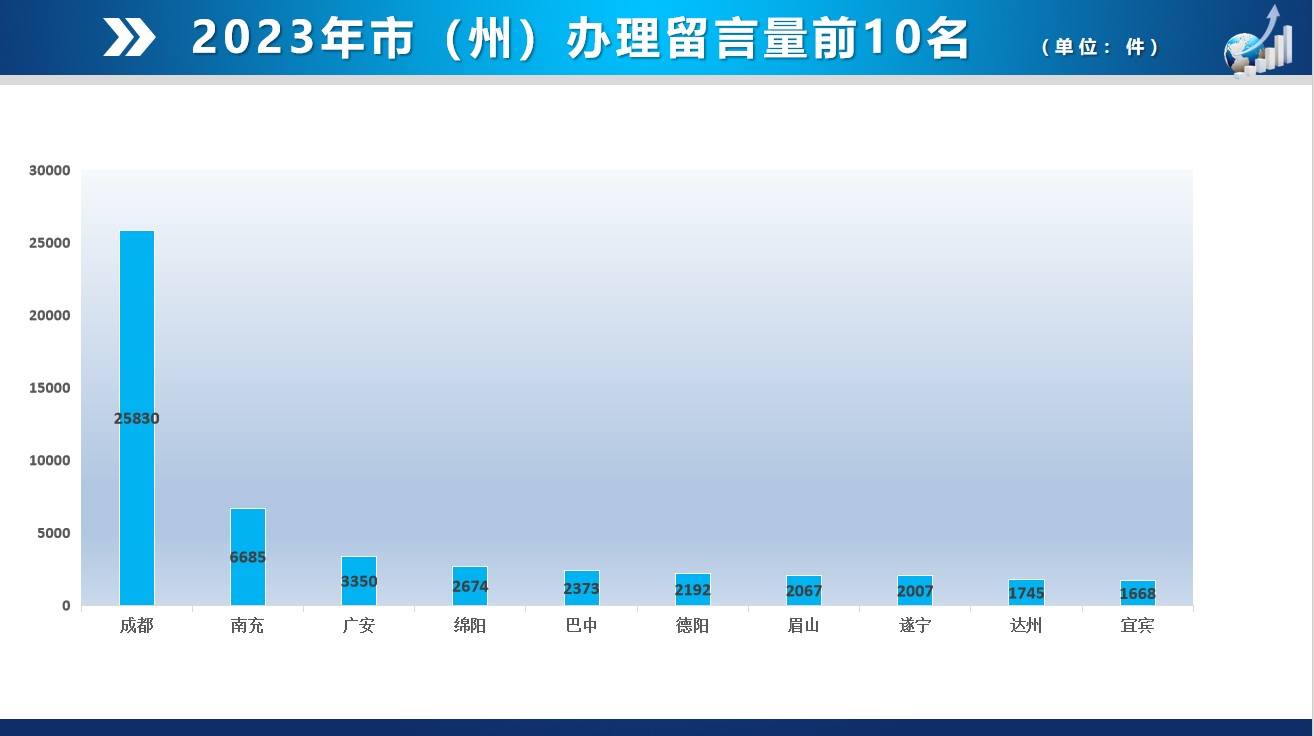 2023年,全省哪些市(州)回应群众最积极、高效?综合全年数据来看,成都、南充、广安、绵阳、巴中收到量和办结量较多,其中成都分别以全年26955件和25830件位居收到量和办结量榜首;内江、资阳、广元、甘孜、广安群众满意度较高;办理速度最快的市(州)分别是达州、眉山、绵阳、甘孜;此外,南充、德阳、雅安收到量与2022年相比,有大幅提升。