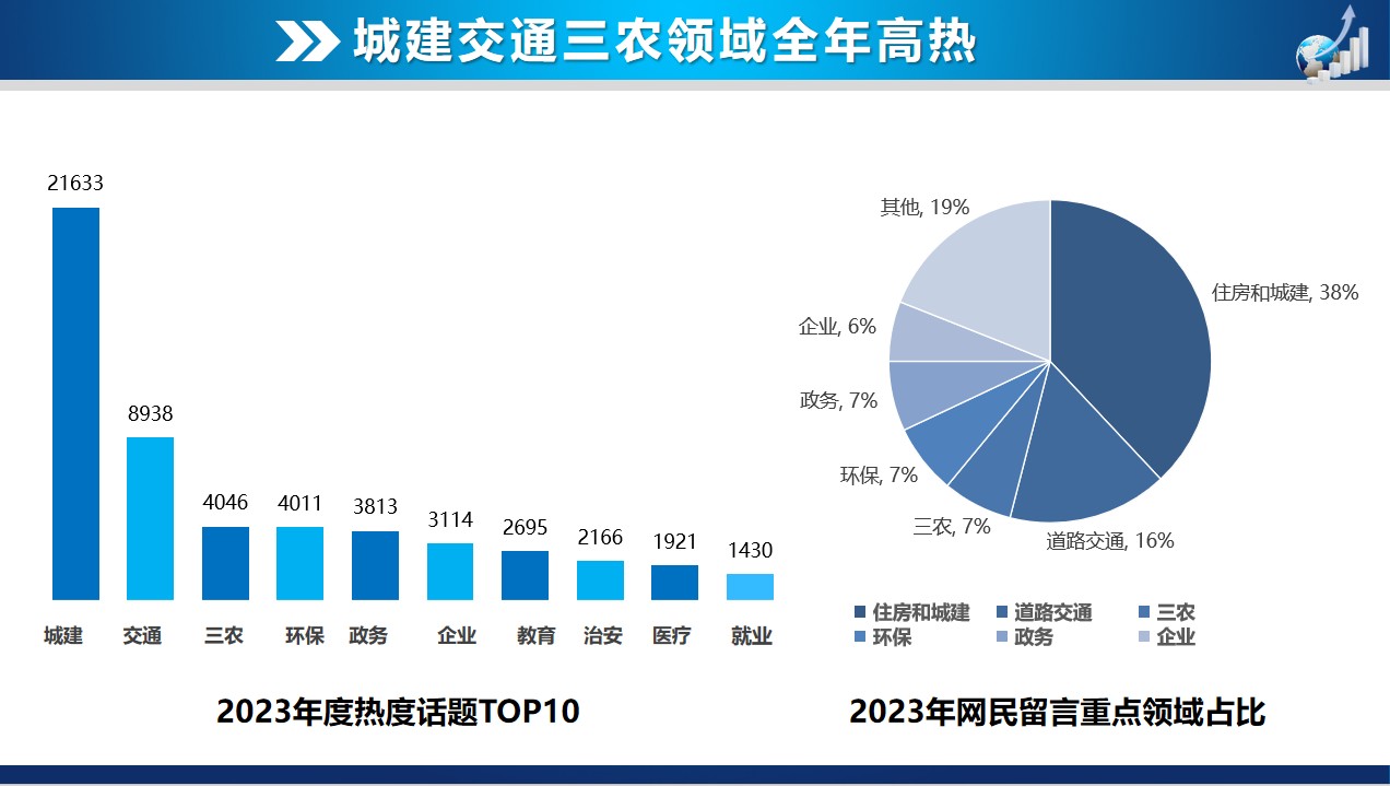 “群众呼声”平台关注度较高的领域有哪些?分析全年留言数据,城乡建设、道路交通、三农、环境保护、政务服务、企业、教育、治安、医疗、就业领域的话题热度位列前十。