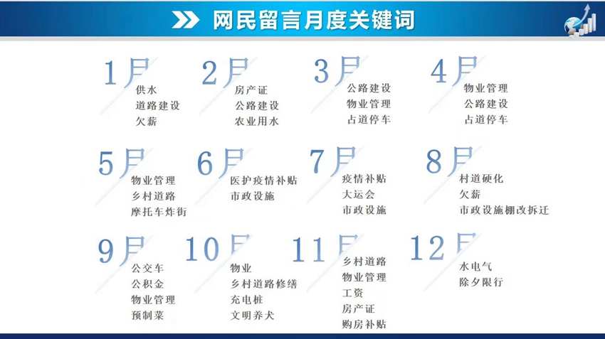 综合热点数据,2023年每月热点关键词为:1月:供水、道路建设、欠薪;2月:房产证、公路建设、农业用水成为群众最关注的问题;3月:公路建设、物业管理、占道停车;4月:物业管理、公路建设、占道停车是关键词;5月:物业管理、乡村道路、摩托车炸街;6月:网民关注医护疫情补贴、市政设施等问题;7月:疫情补贴、大运会、市政设施;8月:村道硬化、欠薪、市政设施棚改拆迁等方面的留言较多;9月:公交车、公积金、物业管理、预制菜;10月:物业、乡村道路修缮、充电桩、文明养犬是网民关注焦点;11月:乡村道路、物业管理、工资、房产证、购房补贴;12月:水电气、除夕限行等问题成为问政留言关键词。