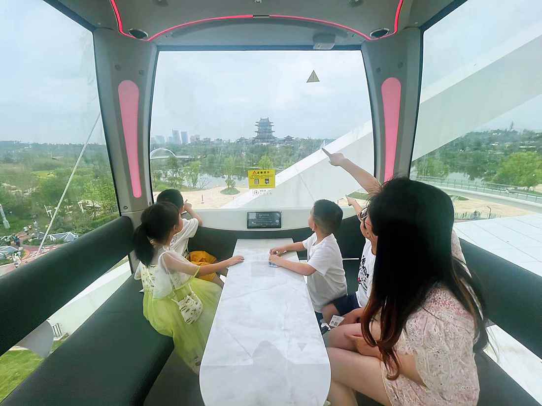 乘坐摩天轮,游客几乎可以将主会场所有展馆的风景收入眼中,还能看到园外城市的风景。轿厢内配备了空调系统、蓝牙音响、无线对讲机、氛围灯及内饰座椅,在保障安全性的前提下,更具现代感也更加人性化。