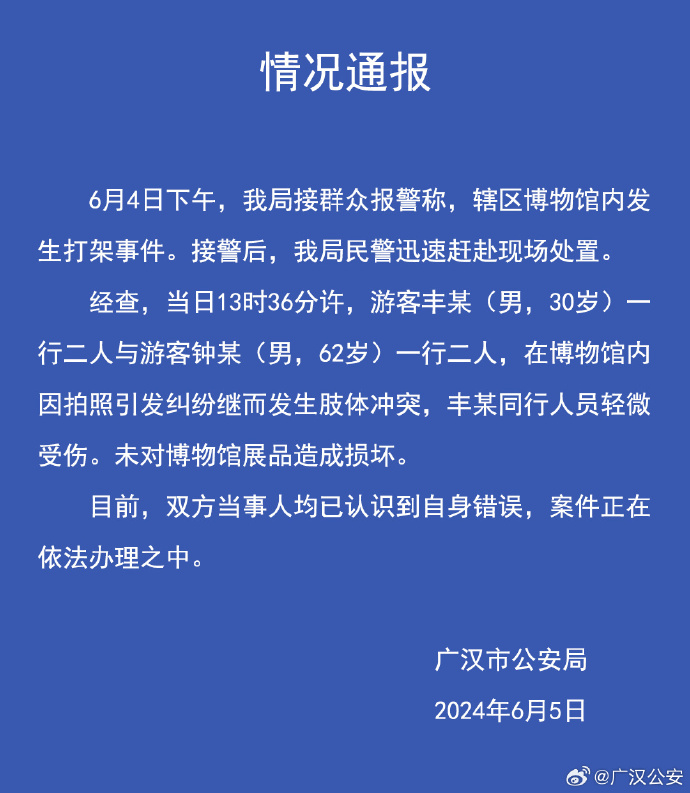 6月5日四川广汉公安发布通报:6月4日下午,我局接群众报警称,辖区博物馆内发生打架事件。接警后,我局民警迅速赶赴现场处置。
