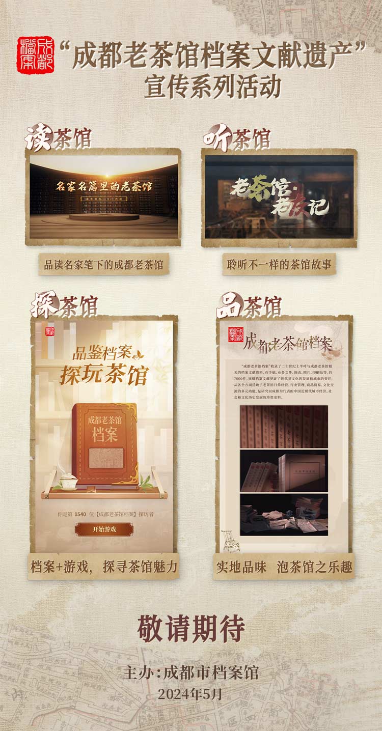 在第17个国际档案日来临前夕,成都市档案馆倾力推出“成都老茶馆档案文献遗产”系列宣传活动,以“读、听、探、品”四个维度,解读关于成都老茶馆的档案和故事,让公众从视觉、听觉、触觉、味觉全方位体验老茶馆文化。通过精心制作的互动游戏,让你一秒穿越回百年前的成都,置身于那些光影斑驳的老茶馆中,点茶一碗、赏戏一折、读报一张,感受川人在时代洪流中的那份从容与淡然。