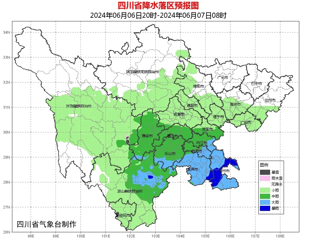 广元、绵阳、德阳、成都、遂宁、南充、巴中、达州8市阴天转多云,部分地方有阵雨,盆地其余地方阴天有阵雨或雷雨,雨量普遍中雨,其中宜宾、泸州2市及自贡、内江2市东部和雅安、乐山2市南部有大雨,局部暴雨;川西高原和攀西地区阴天间多云,大部地方有阵雨或雷雨,其中甘孜州东部、阿坝州南部、凉山州中部北部有中雨,局部大雨,个别暴雨。