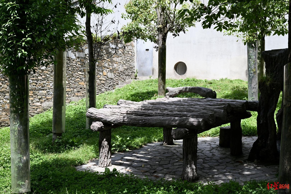 神树坪基地展区有不同的独立小院、大草坪,大熊猫们或享受独立的院落,或“一家人”住在一个小院。小院外面不仅有熊猫爬架、石头搭建的“房子”、大树等供大熊猫休闲、乘凉、活动的装置,甚至还有“戏水池”景观。奶爸、奶妈们会在大熊猫活动区域放上竹子、竹笋、苹果、窝窝头等食物。