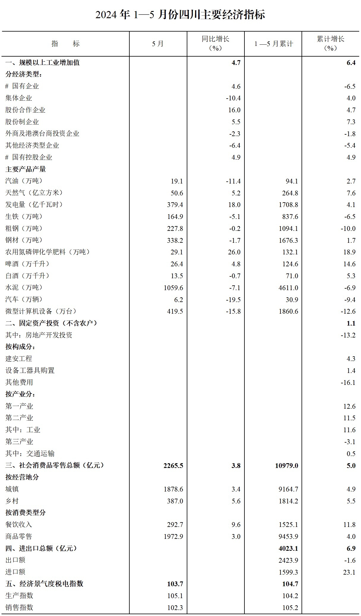 四川新闻网-首屏新闻成都6月18日讯(记者 陈淋)6月18日,四川省统计局发布了2024年1—5月四川省国民经济主要指标数据。