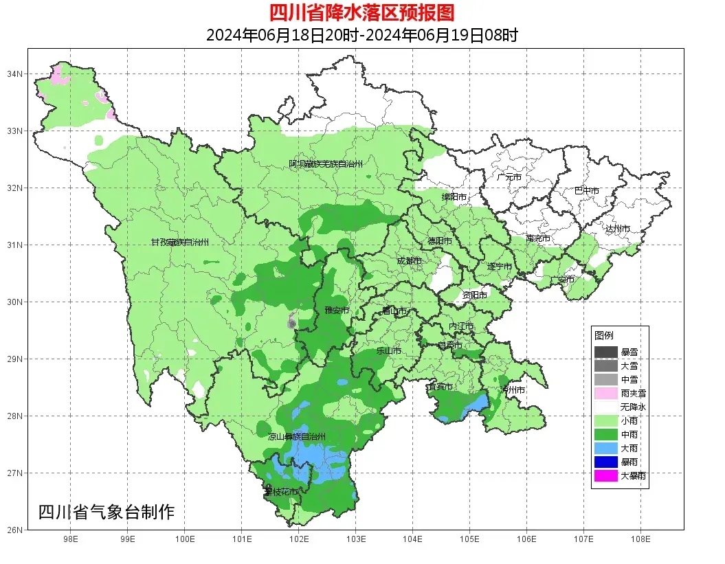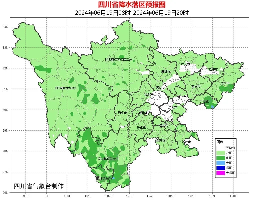 盆地大部阴天间多云有阵雨或雷雨,雅安、泸州、宜宾3市和眉山、乐山2市西部及达州、广安、内江、自贡4市东部有中雨,局部大雨;川西高原和攀西地区阴天间多云有阵雨或雷雨,部分地方有中雨,其中凉山州中部南部和攀枝花市部分地方大雨,局部暴雨。