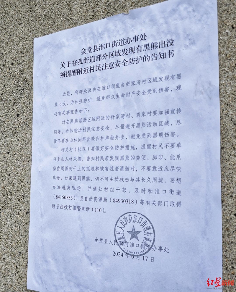 自从冉金玉家的监控拍到黑熊的视频后,当地淮口街道办事处提醒附近村民注意安全防护的告知书贴满村里各个角落,田坎边、电线杆上、屋檐下,到处都是。上面写着:如果遇到黑熊,切不可主动攻击与其长久周旋,要想办法逃离现场,通知村组干部……