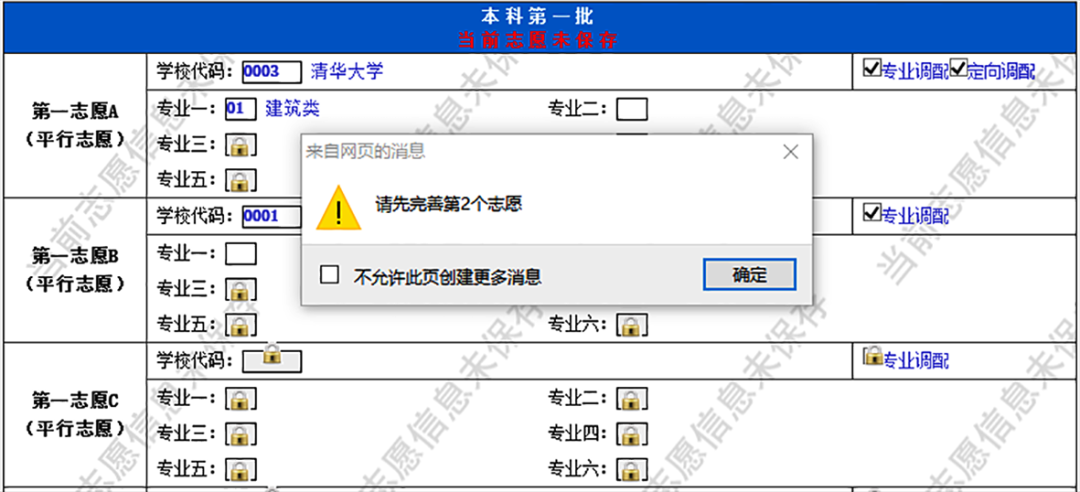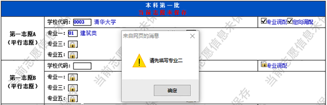 填写志愿时为了避免出现填写信息不完整的情况,系统采取了强制约束填写顺序(暂不能填写的志愿是锁定状态),没有填写一志愿不能填写二志愿;填报了某个学校,却没有填写具体的专业,也不能填写下一个志愿。填写专业时,也要按专业顺序进行填写。没有填写每个志愿的学校,也不能填写其相应的专业。