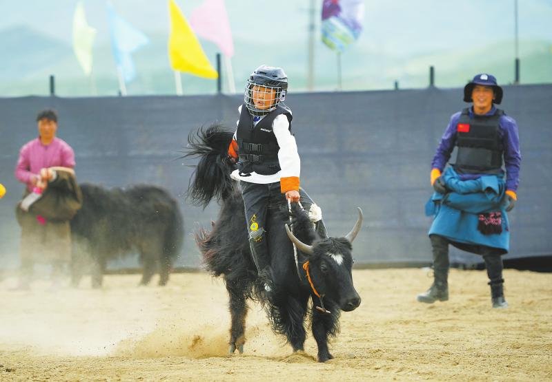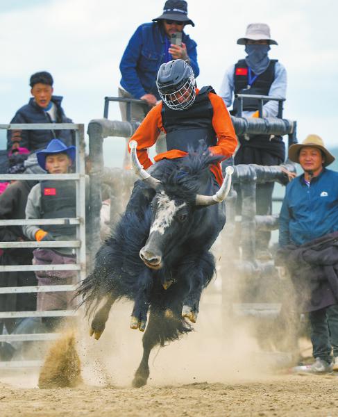6月29日,骑手骑在光滑的牛背上与公牦牛进行“决斗”。