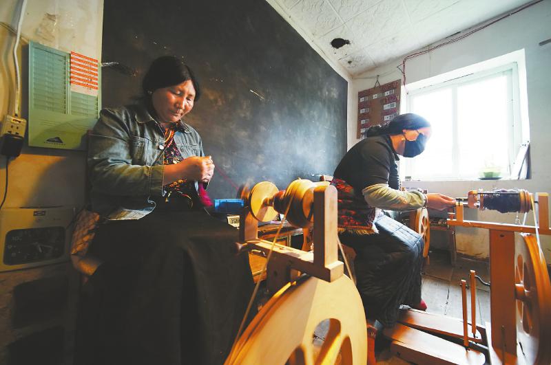 6月28日,红原县邛溪镇的牧民使用捻线机制作牦牛绒毛线。