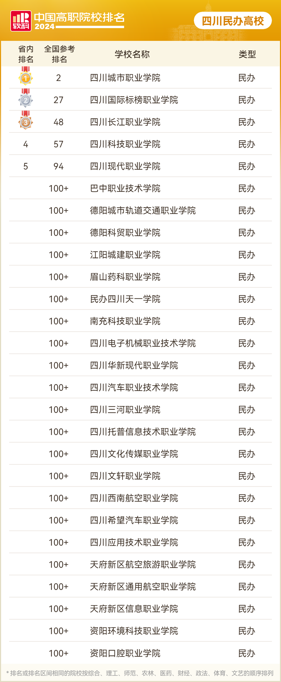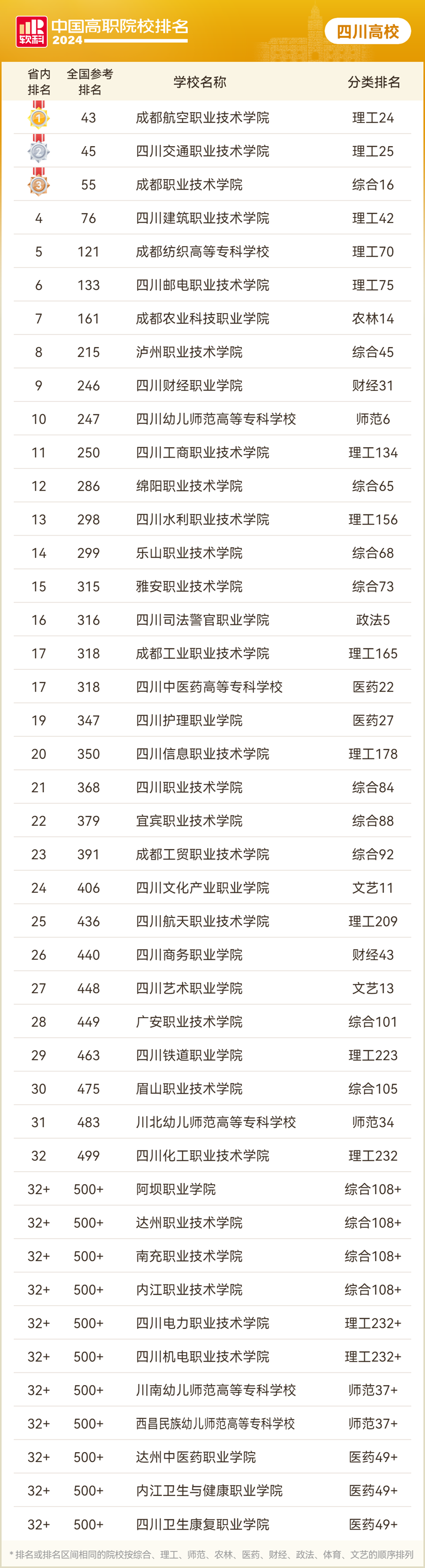 7月3日,高等教育专业评价机构软科发布“2024软科中国高职院校排名”。四川省今年共有70所高职院校上榜,其中公办高职院校上榜43所。
