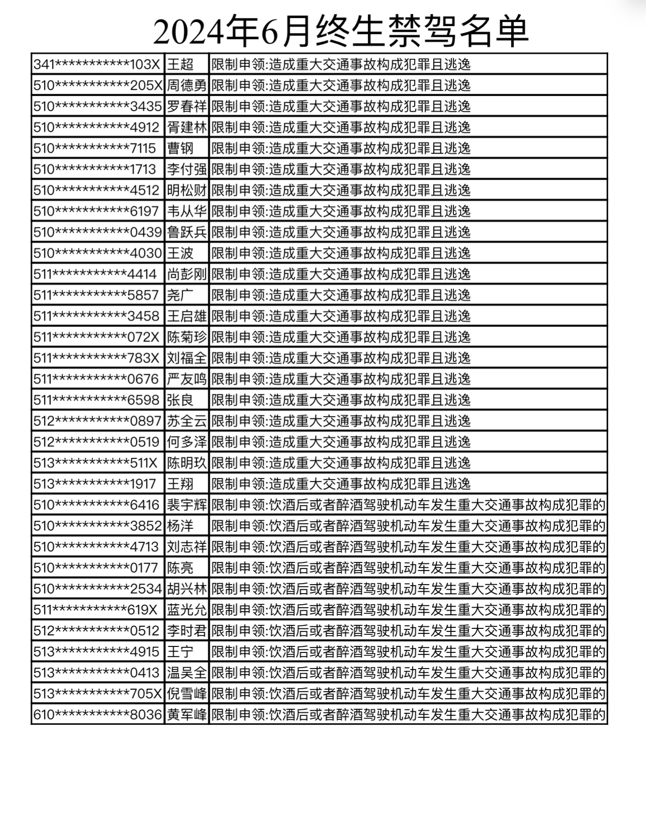 四川公安交警公布6月终生禁驾名单