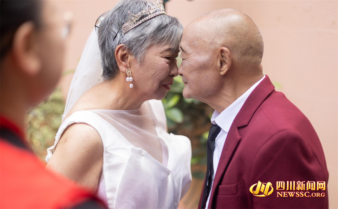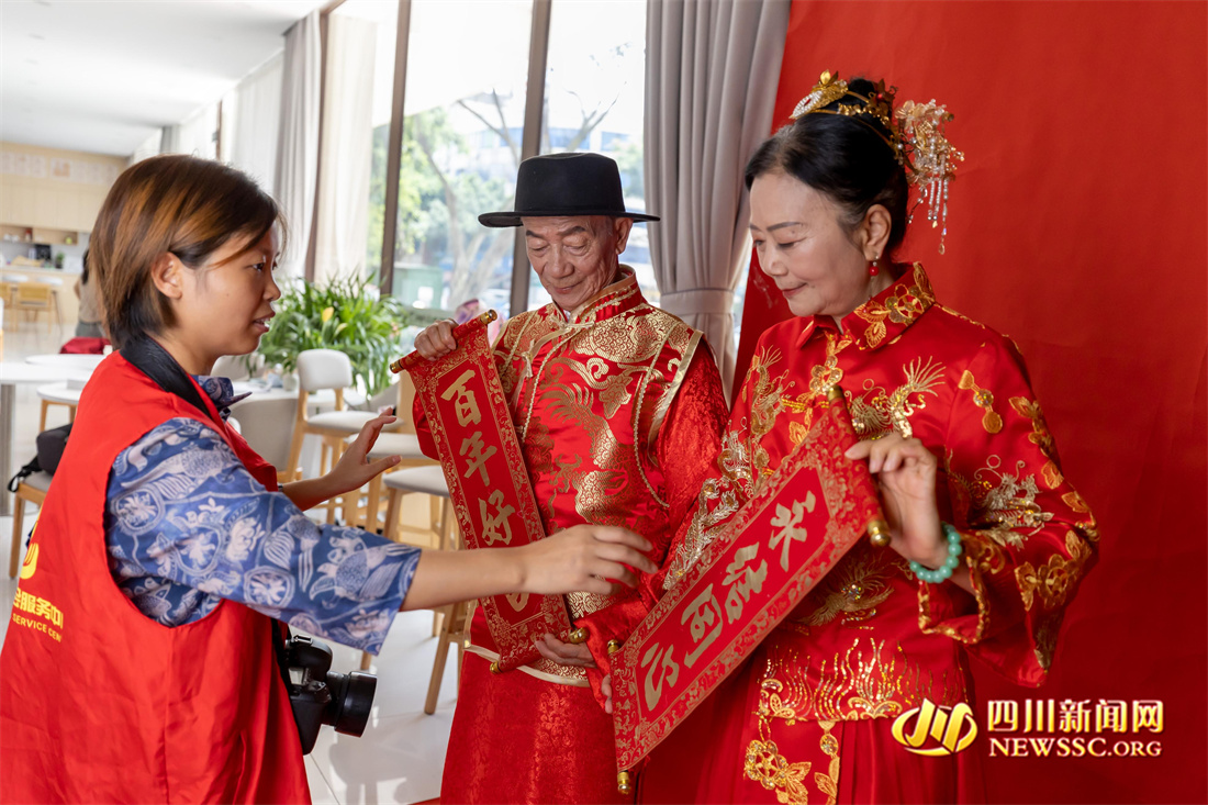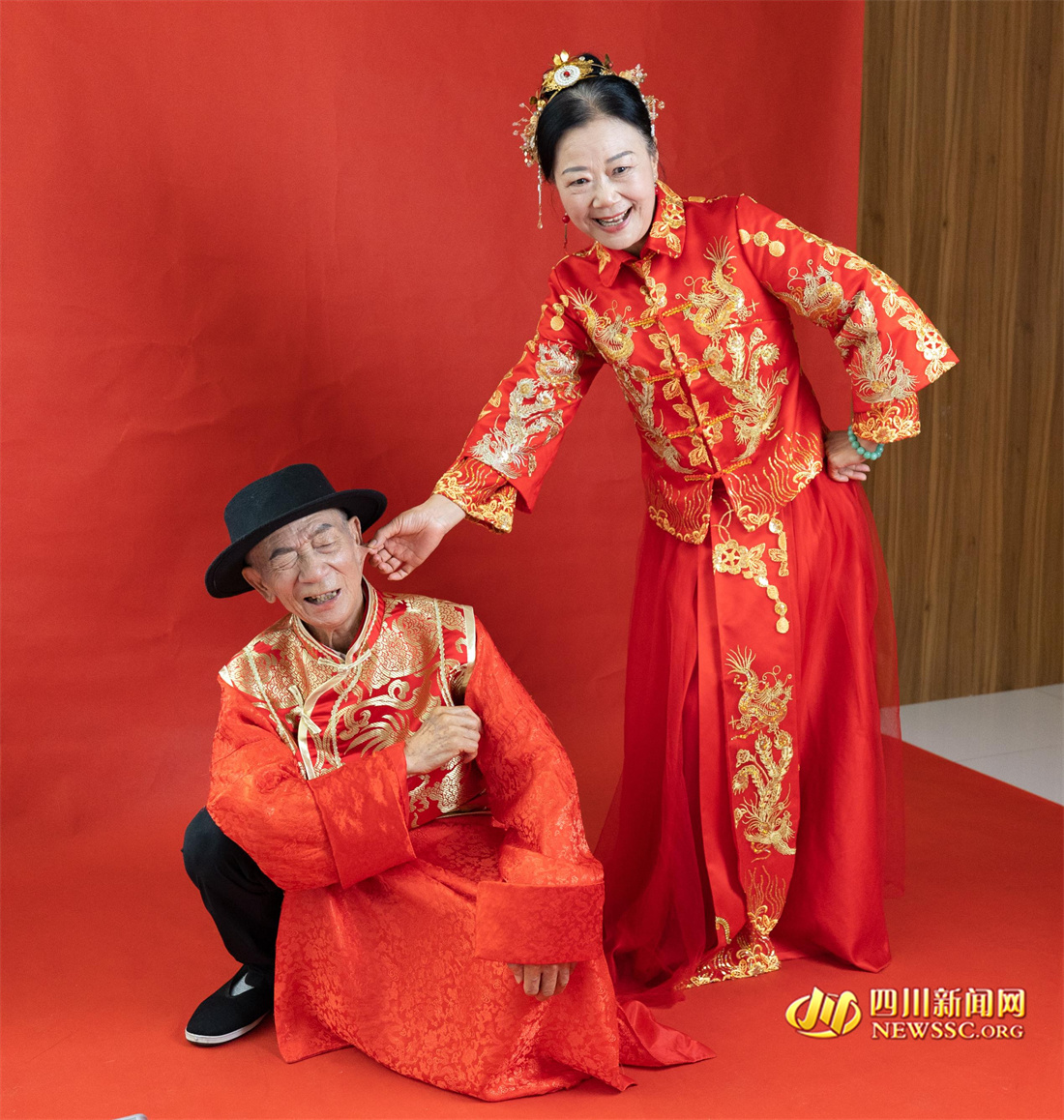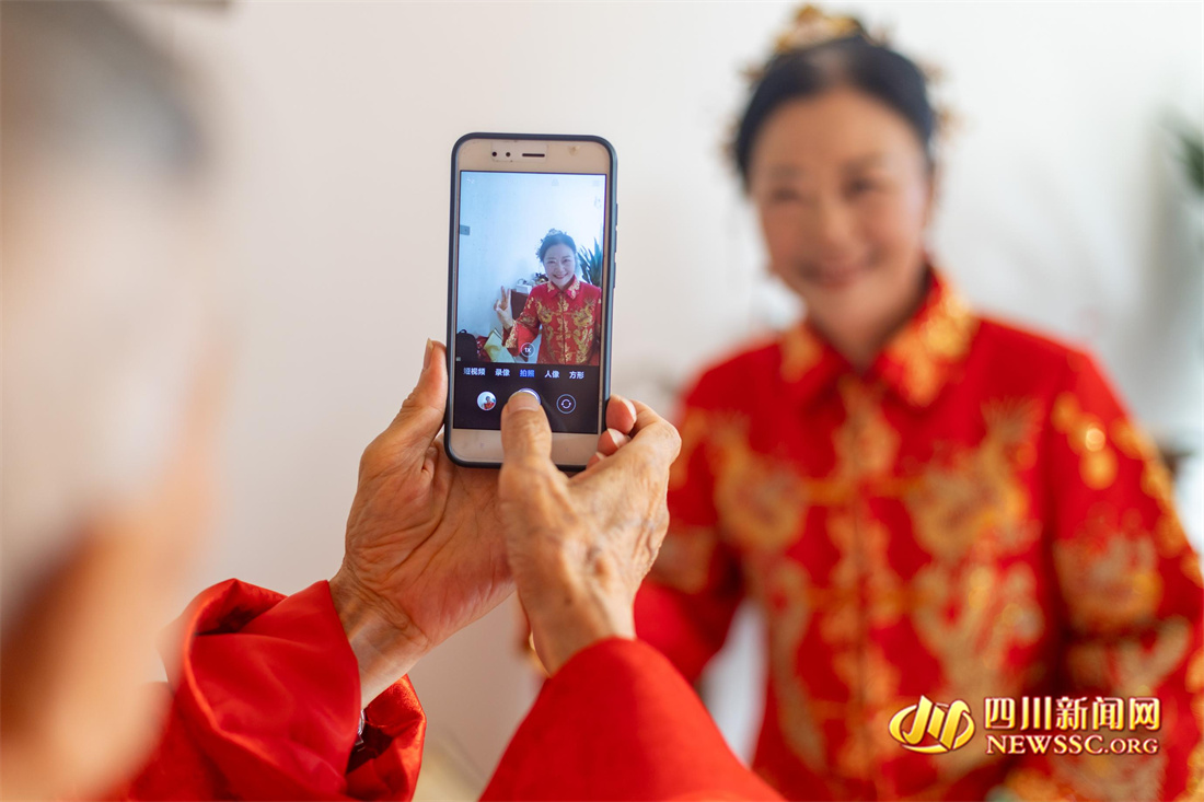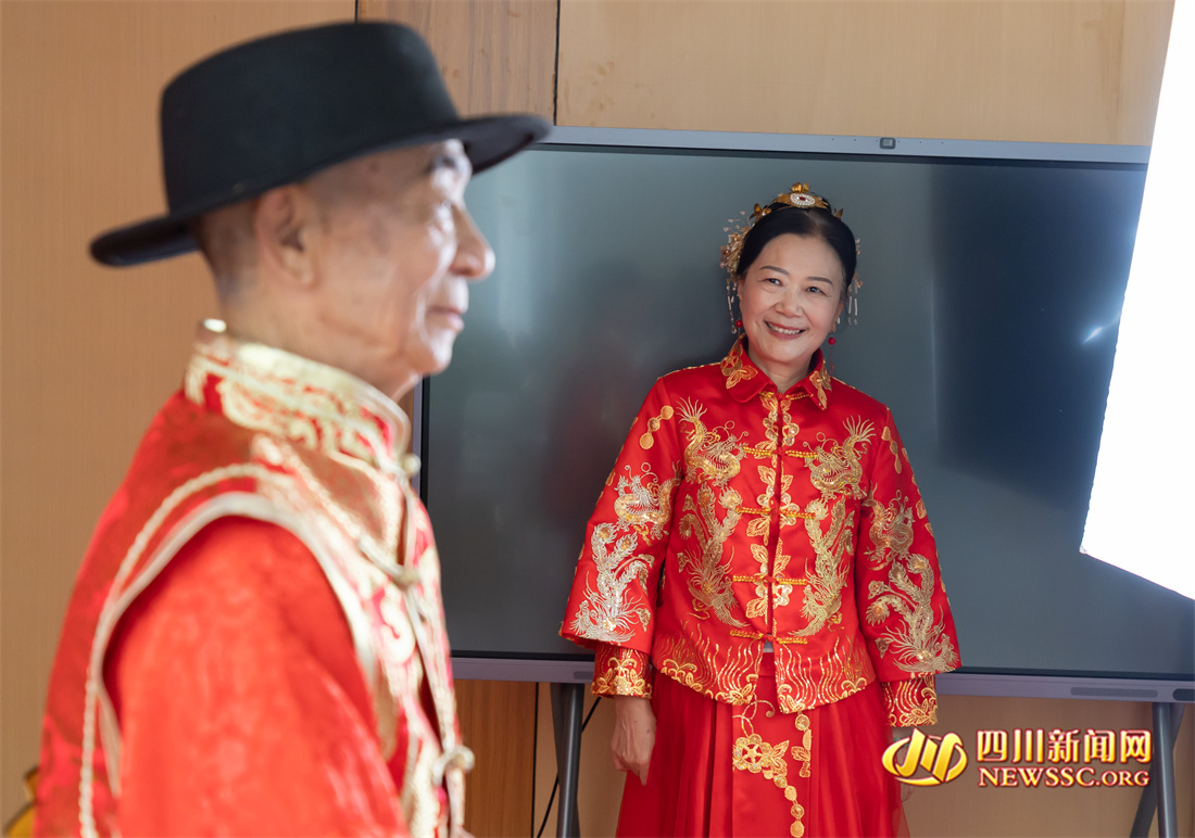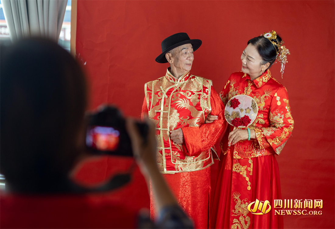 四川新闻网-首屏新闻乐山7月13日讯(记者 李举涛 摄影报道)7月12日,乐山峨眉山市胜利街道三台山社区大厅,80岁的张瑜老人和老伴儿陈琴有了人生中第一张婚纱照。照片中,两人身着火红秀禾,四目相对,脉脉含情,脸上写满了幸福与甜蜜。