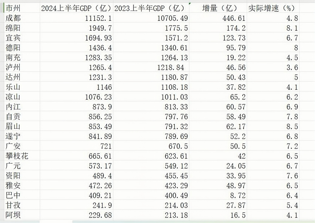 从各市州2024年上半年GDP总量来看,与2023年同期相比,排名没有发生任何变化。成都一马当先,超过了1.1万亿元,占全省比重约38%。绵阳接近2000亿元大关,宜宾接近1700亿元,继续稳坐榜眼、探花位置。在1000亿到1500亿区间有德阳、南充、泸州、达州、乐山、凉山6个市州,数量与2023年持平。其中,德阳和南充上半年GDP的差距,由2023年的不到80亿元,扩大到2024年的超过150亿元,德阳的优势渐趋明显。内江、自贡、眉山、遂宁等7市则保持在500亿到1000亿区间,其中4个市总量在840亿到880亿之间,估计下半年你追我赶的态势将更趋白热化。全省另有5个市州上半年GDP总量在500亿以下。