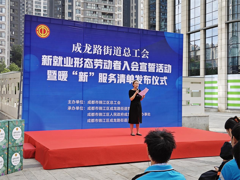 为进一步落实新就业形态劳动者建会入会工作,增强新就业形态职工的凝聚力、向心力,切实提升新就业形态劳动者的幸福感,8月16日,锦江区成龙路街道总工会在R29职工驿站开展新就业形态劳动者入会宣誓活动暨暖“新”服务清单发布仪式。来自美团、饿了么、盒马等平台企业的近百名职工代表参加了发布仪式。