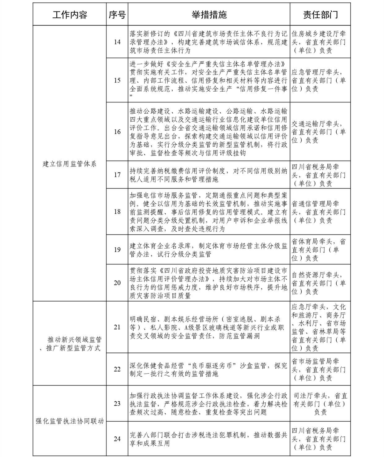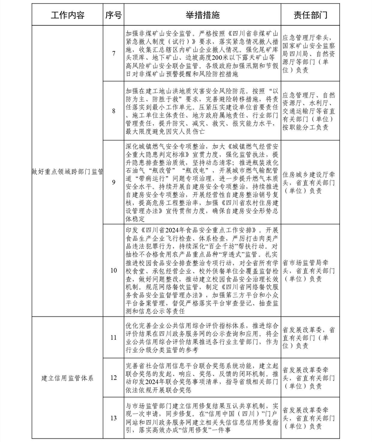 记者从省政府网站获悉,今日,省政府办公厅发布《关于印发<2024年推进跨部门综合监管重点任务分工表>的通知》(以下简称《通知》),明确了做好重点领域跨部门监管、建立信用监管体系等5项工作内容、27项举措措施。尤其是将危险化学品、烟花爆竹、煤矿安全、非煤矿山安全、城镇燃气安全等列入了重点领域跨部门监管之列。