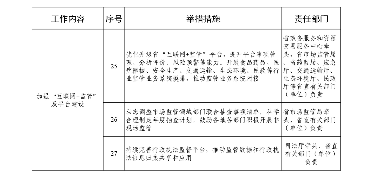 要创新监管方式。各地各有关部门(单位)要依托省“互联网+监管”系统、政务数据共享交换平台等推进审批和监管数据信息共享互通,做到线索互联、监管执法结果互认。加快大数据、人工智能、物联感知、区块链等技术应用,积极开展远程监管、移动监管、预警防控等非现场监管,快速有效协同处置问题。依托12345热线建立公众监督渠道,支持行业协会商会加强行业自律,规范引导中介组织发挥专业监督作用,鼓励“懂行者”、从业人员进行内部检举。