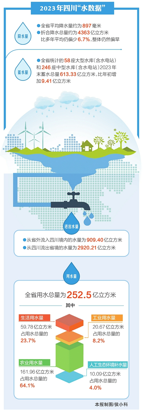 在《公报》中,一组数据引人注目:2023年,从省外流入四川境内的水量为909.40亿立方米,而从四川流出省境的水量为2920.21亿立方米。