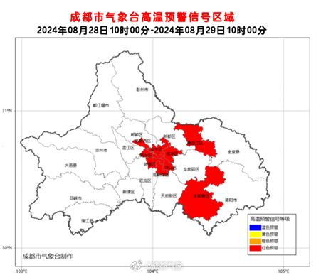 成都市气象台2024年08月29日10时00分继续发布高温红色预警信号:预计成都市武侯区、锦江区、青羊区、成华区、金牛区、高新南区、高新西区和青白江区的所有镇(街道)未来24小时内最高气温将升至37℃以上,东部新区的所有镇(街道)未来24小时内最高气温将升至40℃以上。高温时段主要出现在今日11时至19时。请注意防范。