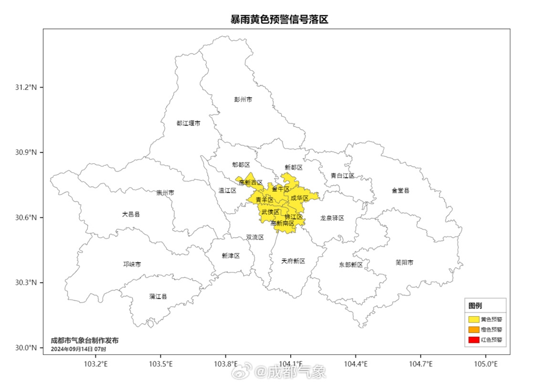成都市气象台2024年09月14日07时40分发布暴雨黄色预警信号:预计未来6小时成都市锦江区、青羊区、金牛区、武侯区、成华区、高新西区和高新南区的大部分镇(街道)降雨量将达50毫米以上。降雨时伴有阵性大风和雷电等强对流天气,请注意防范。