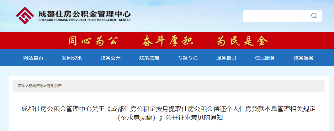 日前,成都市公积金中心发布了《成都住房公积金按月提取住房公积金偿还个人住房贷款本息管理相关规定(征求意见稿)》。