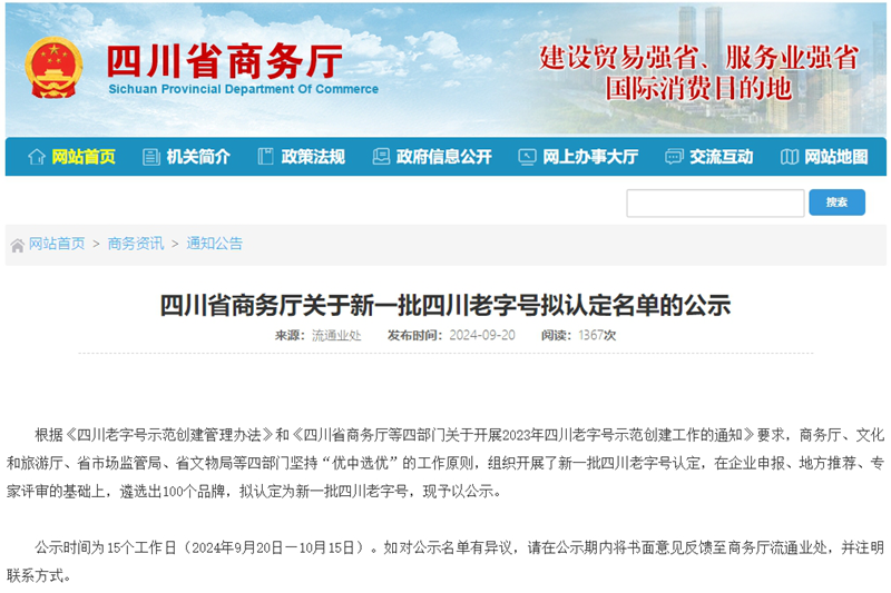 记者从四川省商务厅网站获悉,日前,四川省商务厅公示新一批四川老字号拟认定名单,共100个品牌上榜,公示时间为15个工作日(2024年9月20日—10月15日)。