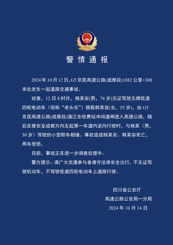 经查,12日8时许,杨某安(男,74岁)无证驾驶无牌低速四轮电动车(俗称“老头乐”)搭载韩某容(女,55 岁),由 G5京昆高速公路(成雅段)蒲江东收费站冲闯道闸进入高速公路,随后在雅安至成都方向左起第一车道内逆向行驶时,与杨某(男,30 岁)驾驶的小型轿车相撞。事故造成杨某安、韩某容死亡,两车受损。