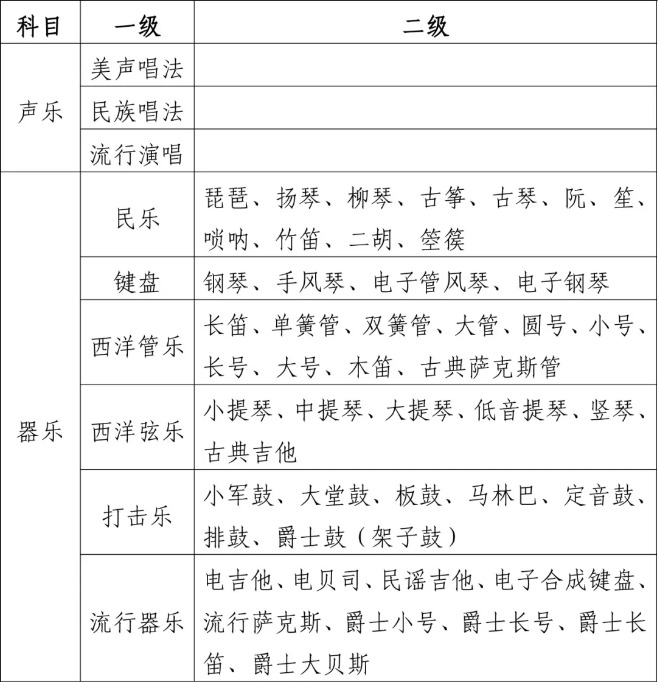 流行器乐专业考试方向乐器种类调整为:电吉他、电贝司、民谣吉他、电子合成键盘、流行萨克斯、爵士小号、爵士长号、爵士长笛、爵士大贝斯。流行器乐科目演奏的乐曲限定为流行或爵士风格作品。键盘(电子管风琴、电子钢琴)专业考生可自带装有考试曲目音色、节奏、节奏音序(Sequence)文件的U盘,考试时允许将U盘插入乐器以供读取,但不能使用乐器的内录声部和自动伴奏功能;流行器乐(电子合成键盘、电吉他)专业考生可使用乐器自带音色功能调选音色,但不能使用乐器内置的内录多声部和自动伴奏功能。