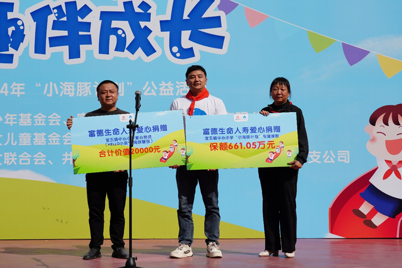 捐赠仪式上,富德生命人寿乐山中支负责人邱竞代表公司向学校捐建价值5万元、藏书5300余册的“小海豚图书馆”1所,捐赠总保障661.05万的专属意外保险117份,并为100名儿童捐赠“小海豚温暖包”等学习用品。邱竞在发言中表示,今年是“小海豚”与宝五小学牵手的第三年,希望孩子们能在“小海豚”的关爱与陪伴下,健康快乐地成长,勇敢地追求梦想,书写属于自己的精彩人生。