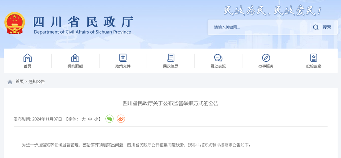 四川省民政厅发布公告 征集民政系统殡葬领域问题线索