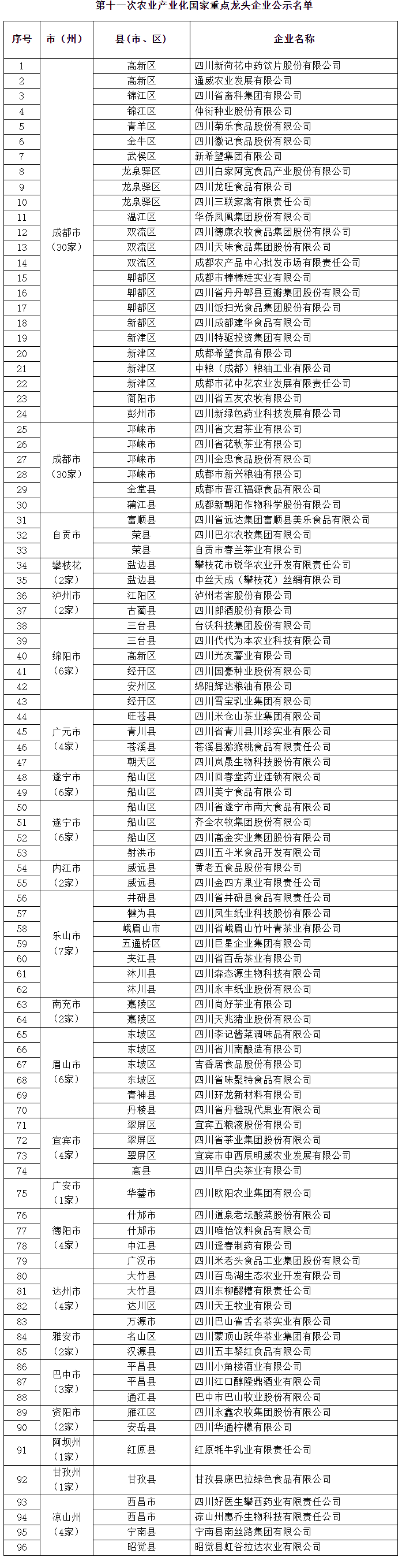 11月8日,四川省农业农村厅网站公示第十一次农业产业化国家重点龙头企业监测结果,四川新荷花中药饮片股份有限公司等96家企业上榜。