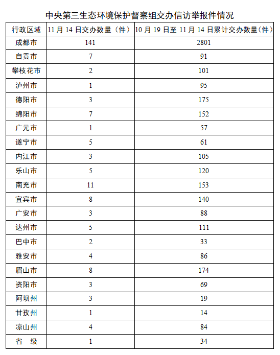 11月14日,中央第三生态环境保护督察组向四川移交第二十七批群众信访举报件228件(来电举报63件,来信举报165件),其中重点关注14件。