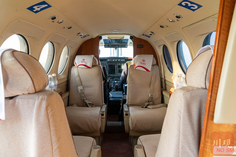 飞机也小。执飞首航的飞机,是通常被用于飞行教学的比奇空中国王C90行政机,头部尖尖的,搭载螺旋发动机。座舱内一共才8个座位,其中2个是驾驶位,旅客座席只有6个。