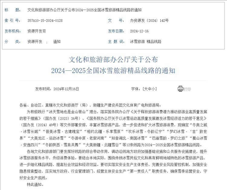 据文化和旅游部网站消息,为丰富冰雪旅游产品,进一步促进和扩大冰雪旅游消费,文化和旅游部确定“冬奥之城·冰雪长城”“晋美冰雪·古建瑰宝”“相约北疆·乐享雪原”“欢乐冰雪·冬韵辽宁”“梦幻冰雪·‘吉’致世界”“大美龙江·运动冰雪”“冬游中原·老家河南”“知音湖北·南国冰雪”“巴渝雪韵·梦幻之旅”“蜀山冰雪·安逸四川”“冬韵陕西·雪泉共舞”“大美新疆·北疆雪谷”等12条线路为2024—2025全国冰雪旅游精品线路。