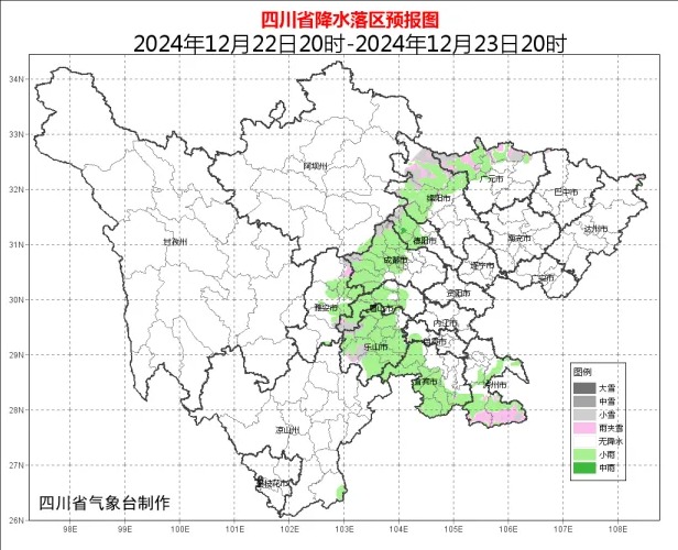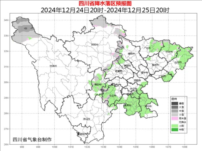 24日晚上到25日白天:盆地大部多云,部分地方阴天有分散小雨或零星小雨,高海拔地区有雨夹雪或小雪;甘孜州西北部和阿坝州北部东部有阵雪,局地有中到大雪,川西高原其余地方和攀西地区以晴间多云天气为主。